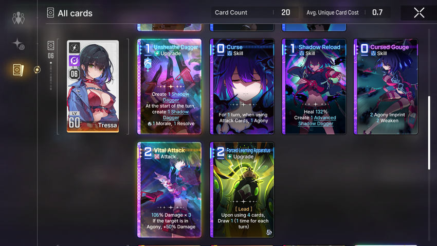 Here's a small example to illustrate: I did two Chaos Event runs, Tier 14, level 8, Nightmare mode. The first one went very well. I did a passing run with a mix of events and combat, no Dimensional Portals, and few camps. Around node 28/34 I had already unlocked all the epiphanies on all my unique cards on all my agents, with the exception of one card. I only took one neutral card for my Tressa , a gear bag (which also had its epiphany, by the way).No other neutral cards on the other characters. The run was enjoyable and ended well.