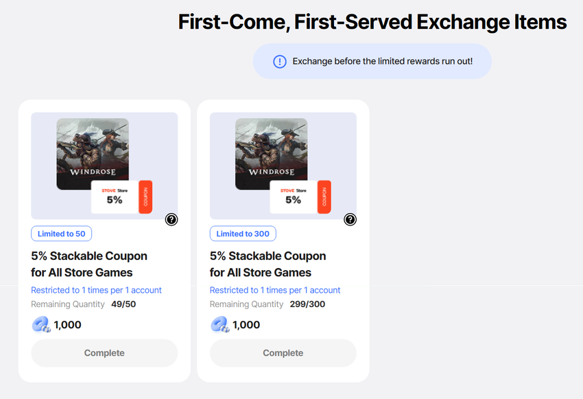 ItemCostSource🏷️ 5% Stackable Coupon1,000STOVE Store Check-in