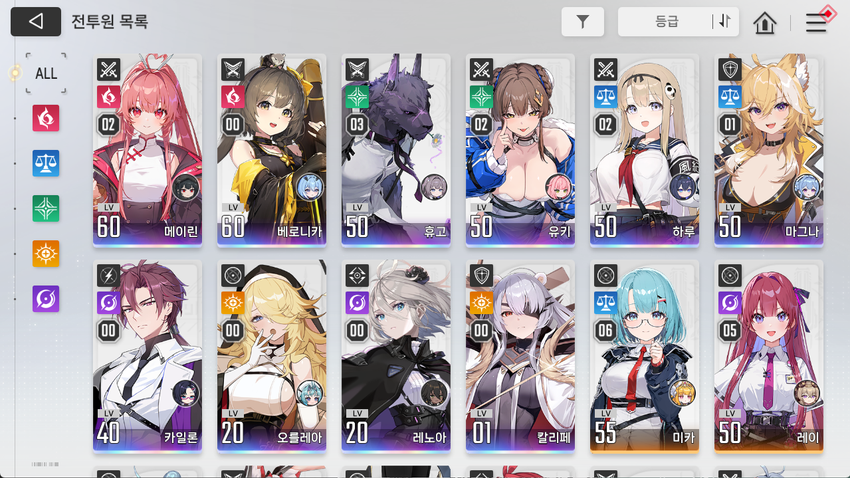 * In order of name (character name) / In order of recruitment (in order of employment in Argent) / In order of rarity (current order) / In order of level (in order of education level)