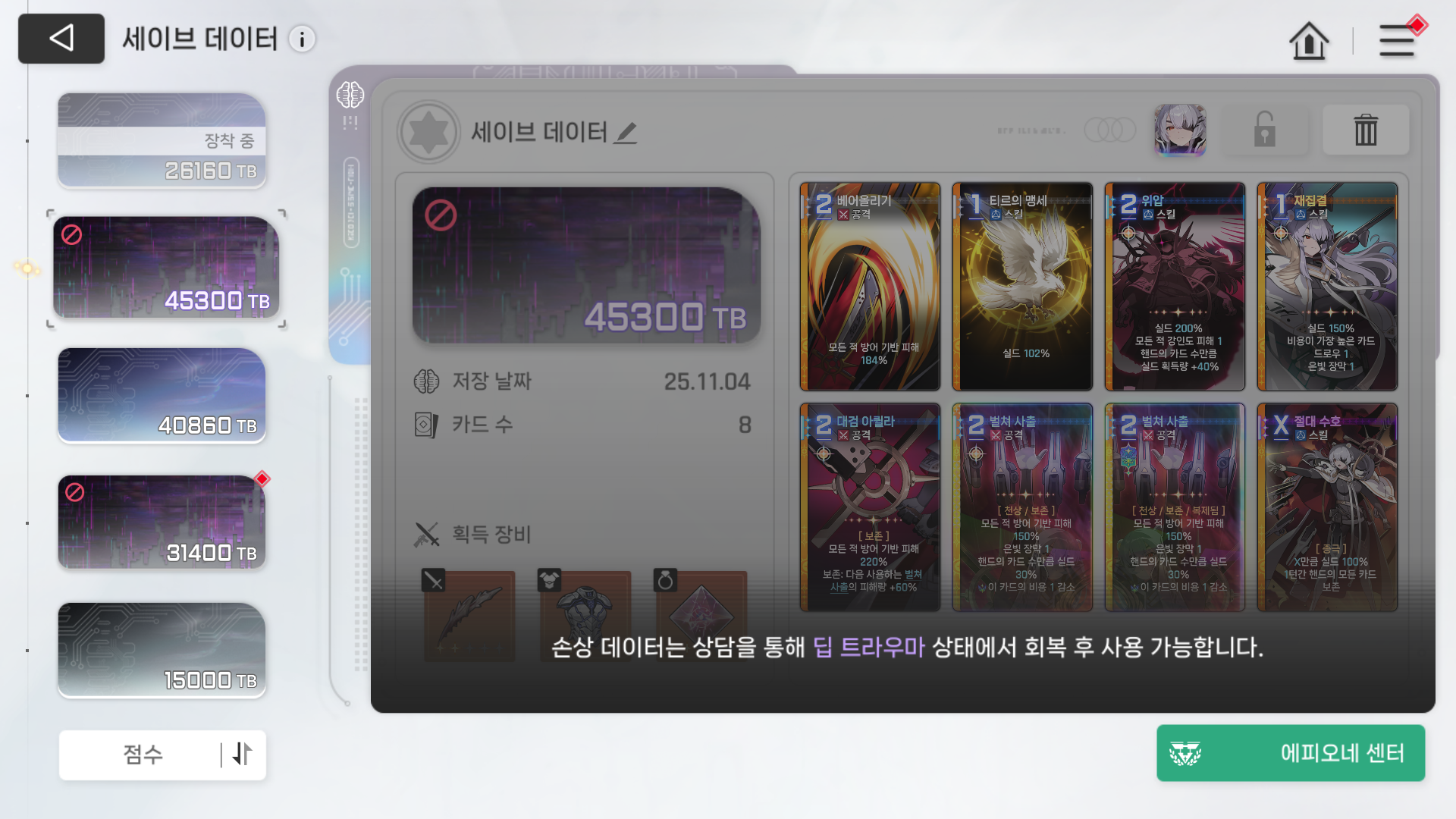 죄송한데 혹시 저거 버그가 아니라 의도된 시스템인 거 알고 계신가요? 혹시 몰라서 댓글 남겨봅니다. 세이브 데이터가 낮다고 나오는 카오스를 돌 경우, 덱 벨류를 아무리 올려도 특정 기준선에서 벗어나면, 시스템이 세이브 데이터 가치를 강제로 낮춰버립니다. 저도 특수 번뜩임 5번 나왔는데 사라진 거 보고 꼬접했습니다.