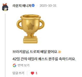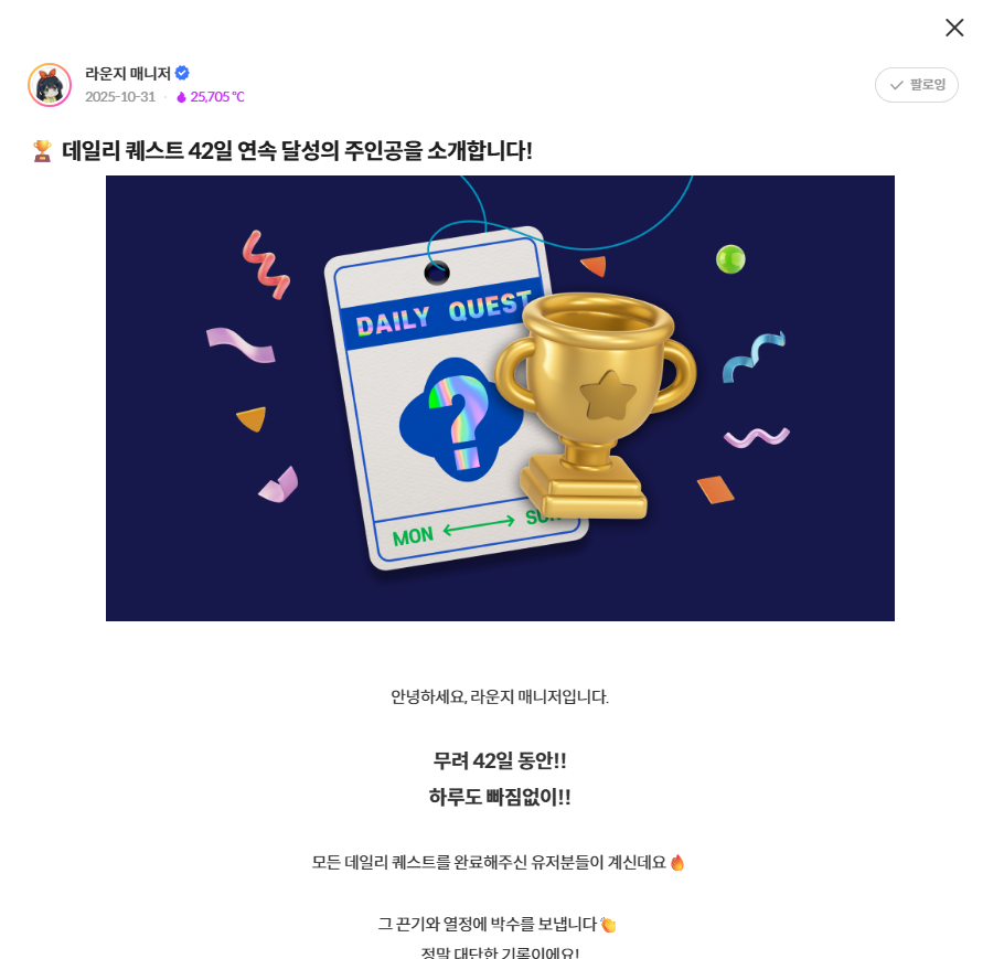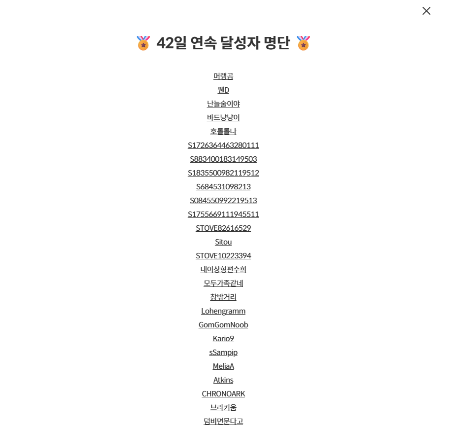 출시 첫날부터 종료일까지 한 번도 빠지지 않고 42일 연속으로 참여한 유저들을 축하해주는 내용이네요!
