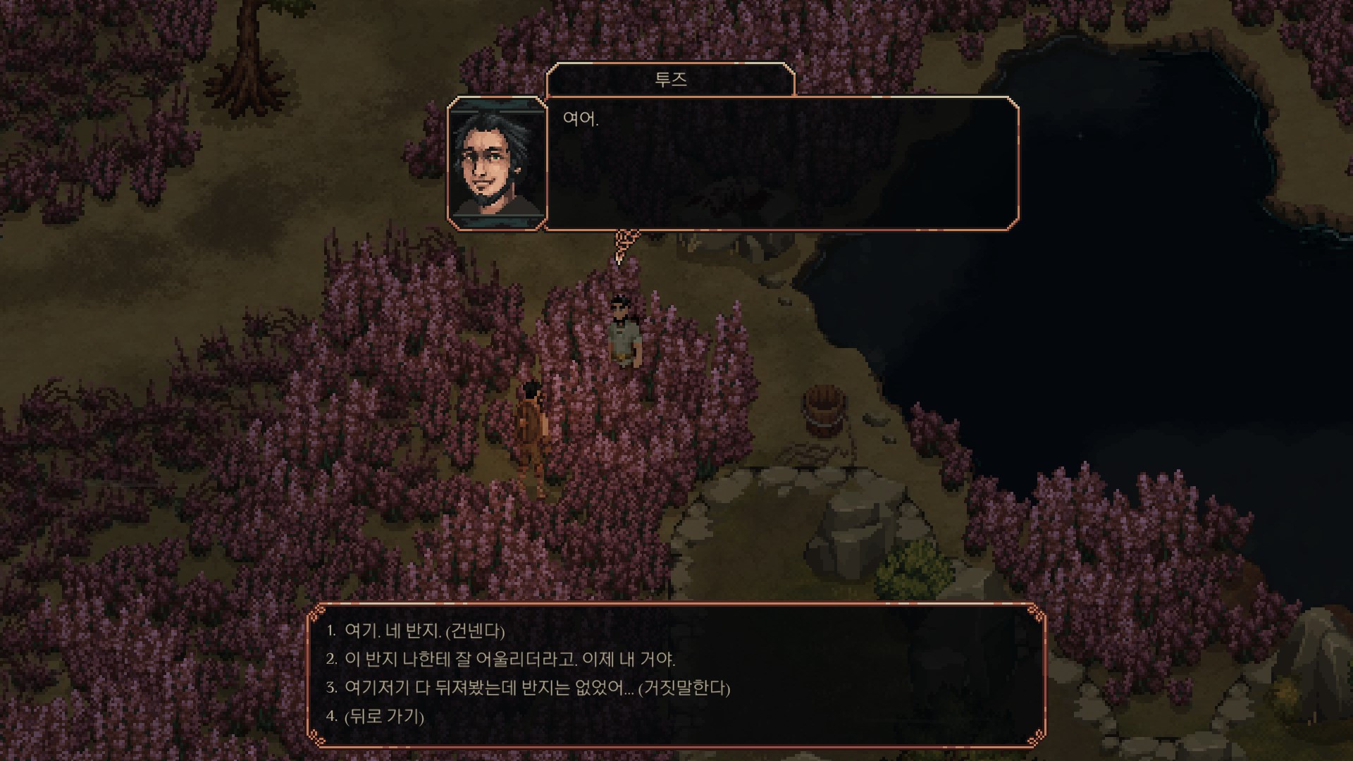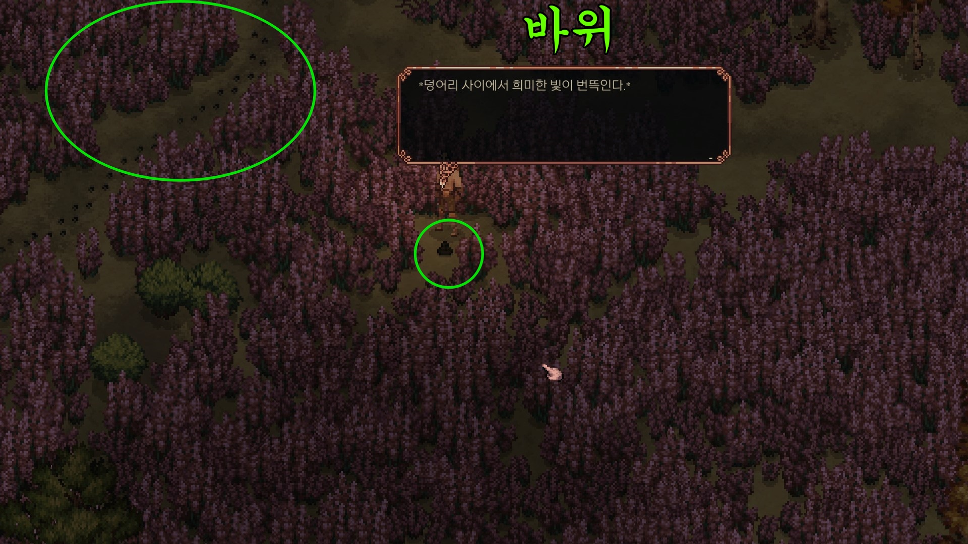 <위로 바위가 있고 양의 발자국이 보이는 근처의 똥 무더기를 조사하면 반지가 나옵니다.>