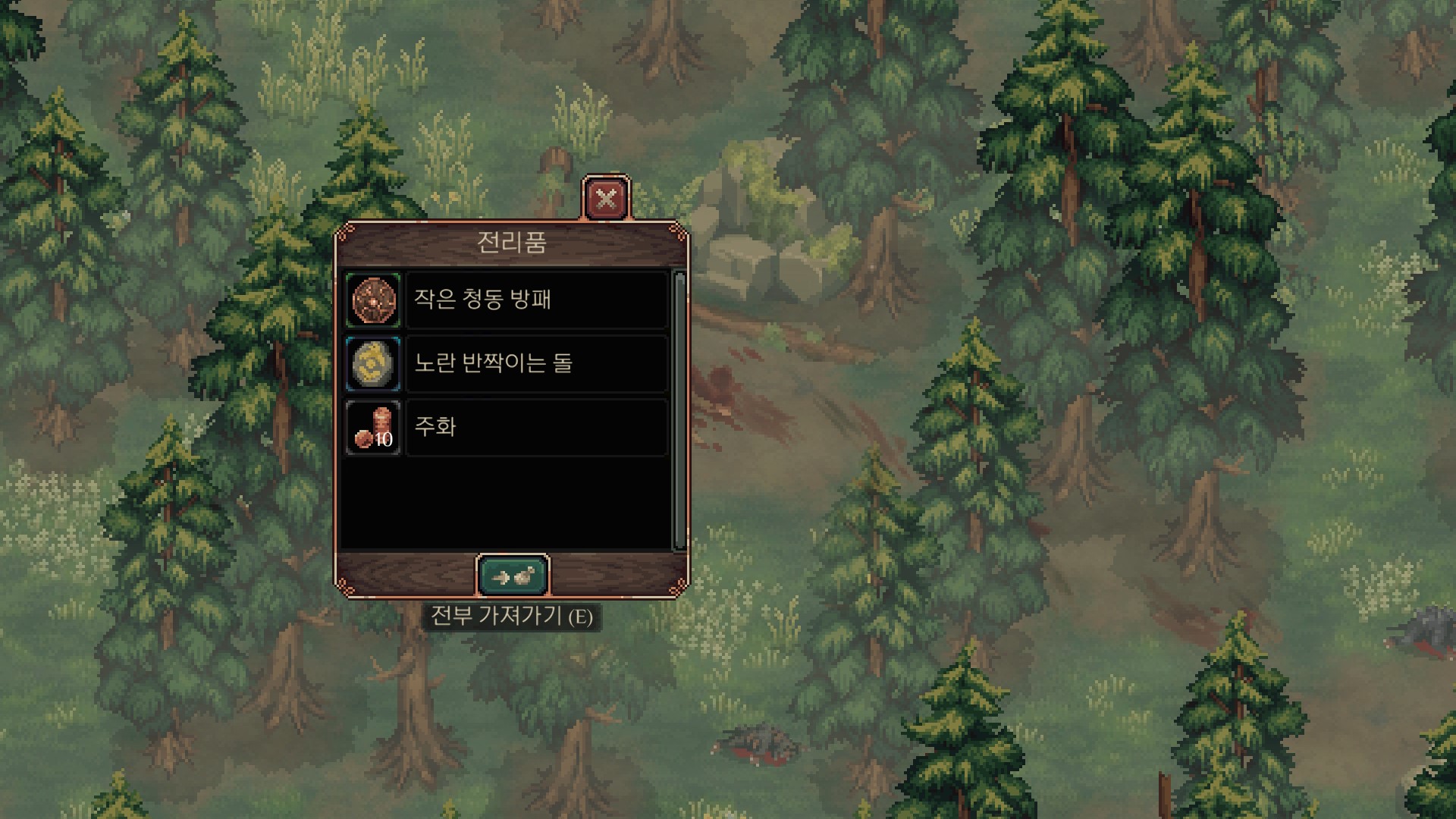 <시신에서 청동 방패와 노란 반짝이는 돌을 얻을 수 있습니다.>
