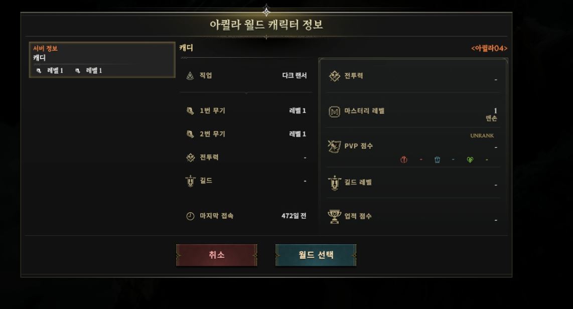 대표케릭이라고 하지도 않는 섭 1렙짜리 정보 뜹니다.