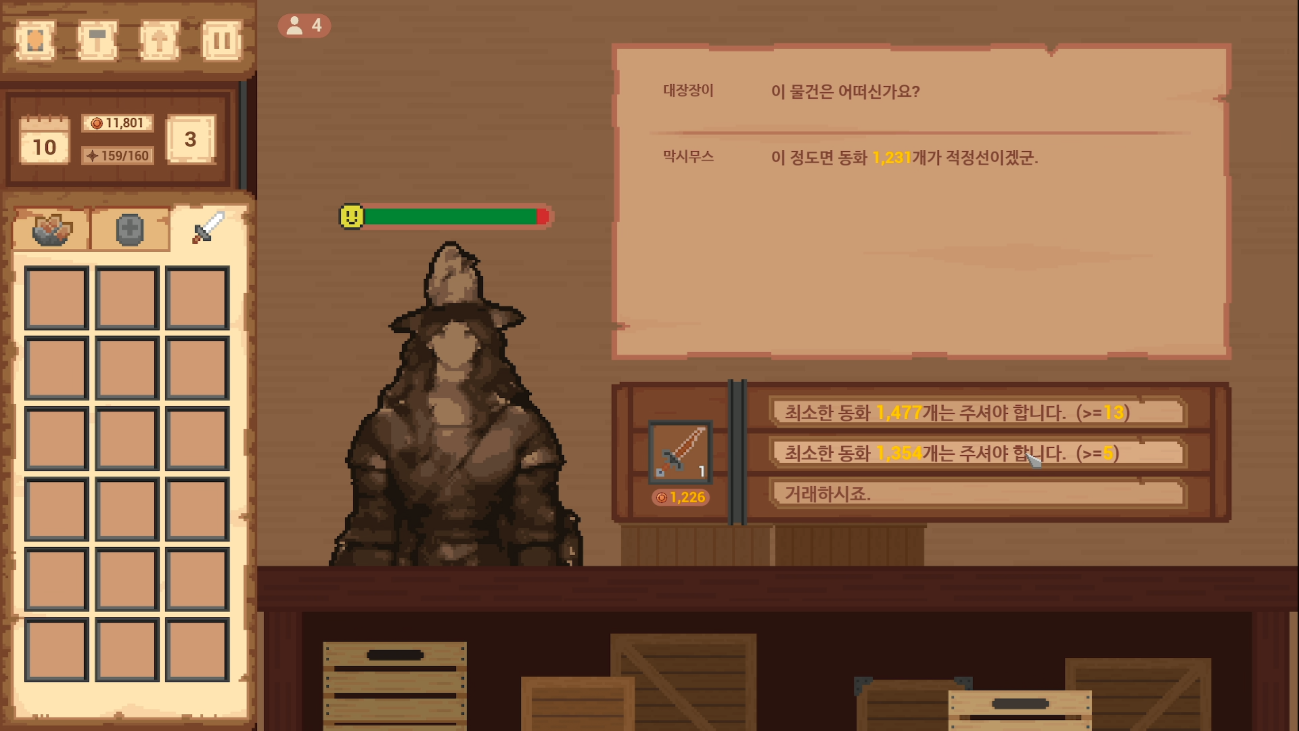 - 나름의 스토리가 흥미롭다. 메인 스토리는 가게의 빚을 갚는 것이지만 게임을 진행하면서 가게 주변에 사건이 발생하거나 왜인지 모르게 싼값에 무기를 팔 수 없겠냐는 소년 NPC, 특정 무기만 구매하는 기사 NPC 등 각각의 이야기가 흥미롭고 어떻게 진행될 지 기대되는 부분이 있다.