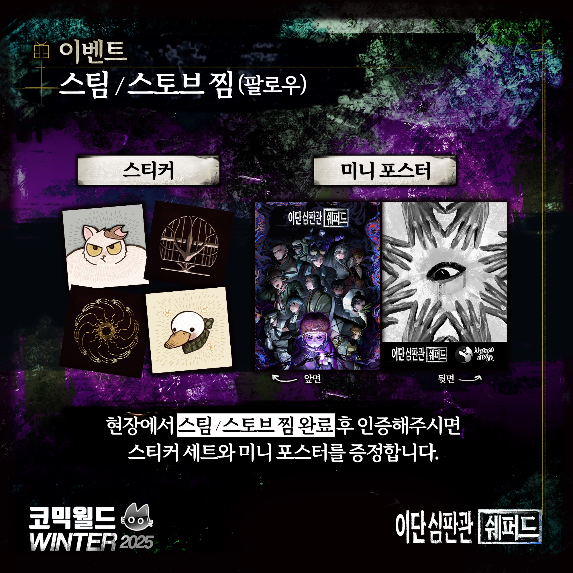 현장에서 이단심판관 쉐퍼드 스팀/스토브 찜 완료 후 인증해 주시면 스티커 세트와 미니 포스터를 증정합니다.