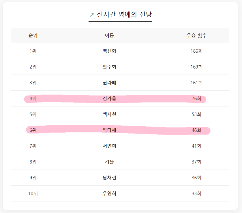 저는 가을선배 투표했는데.. 엄마 (백선화)- 시스터즈 커리큘럼, 주희- 럽딜, 라떼- 럽딜이 강력하네요..