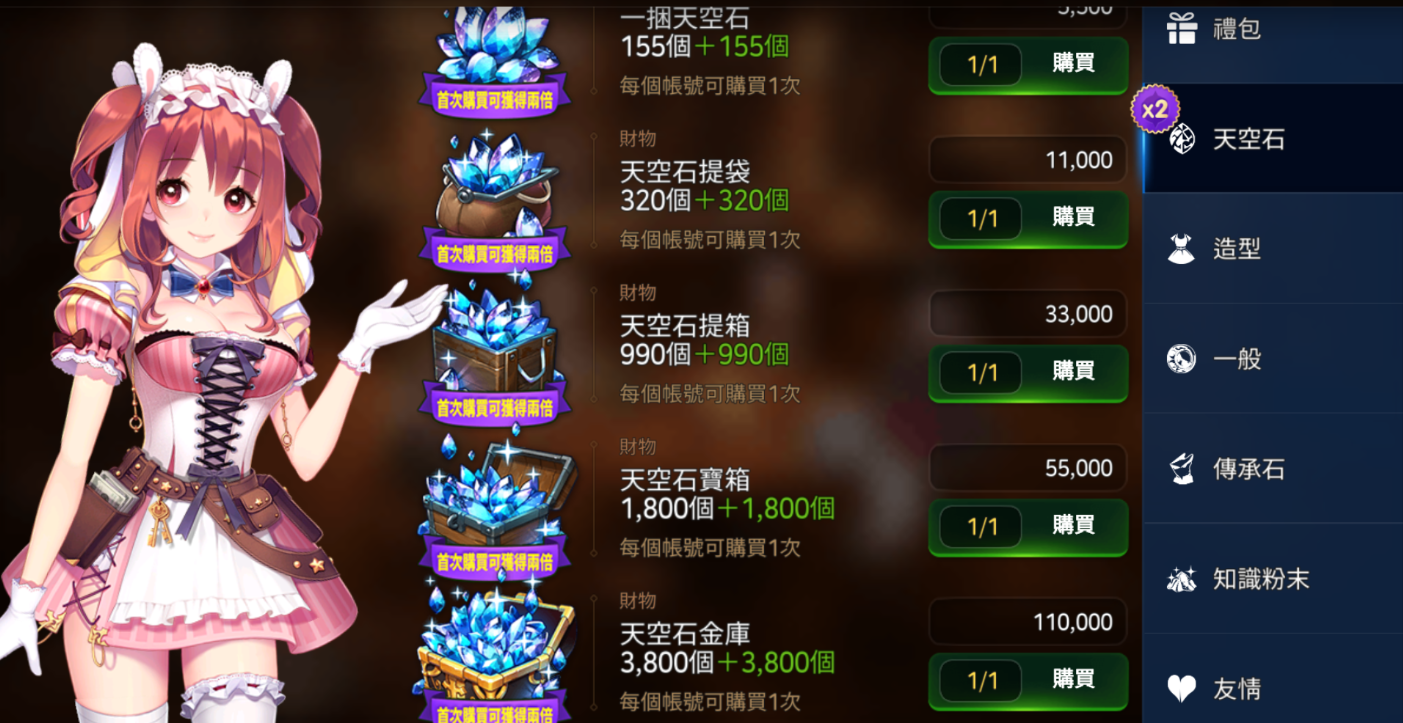 - 首次購買天空石商品時套用的1+1活動將會重置。