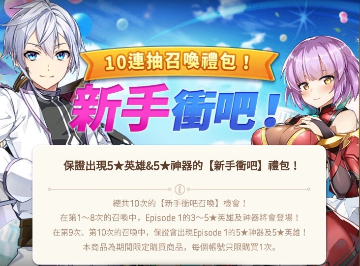 - 購買先前的新手衝吧禮包後,若尚未使用完10次召喚,會從剩下的召喚次數再增加10次。
