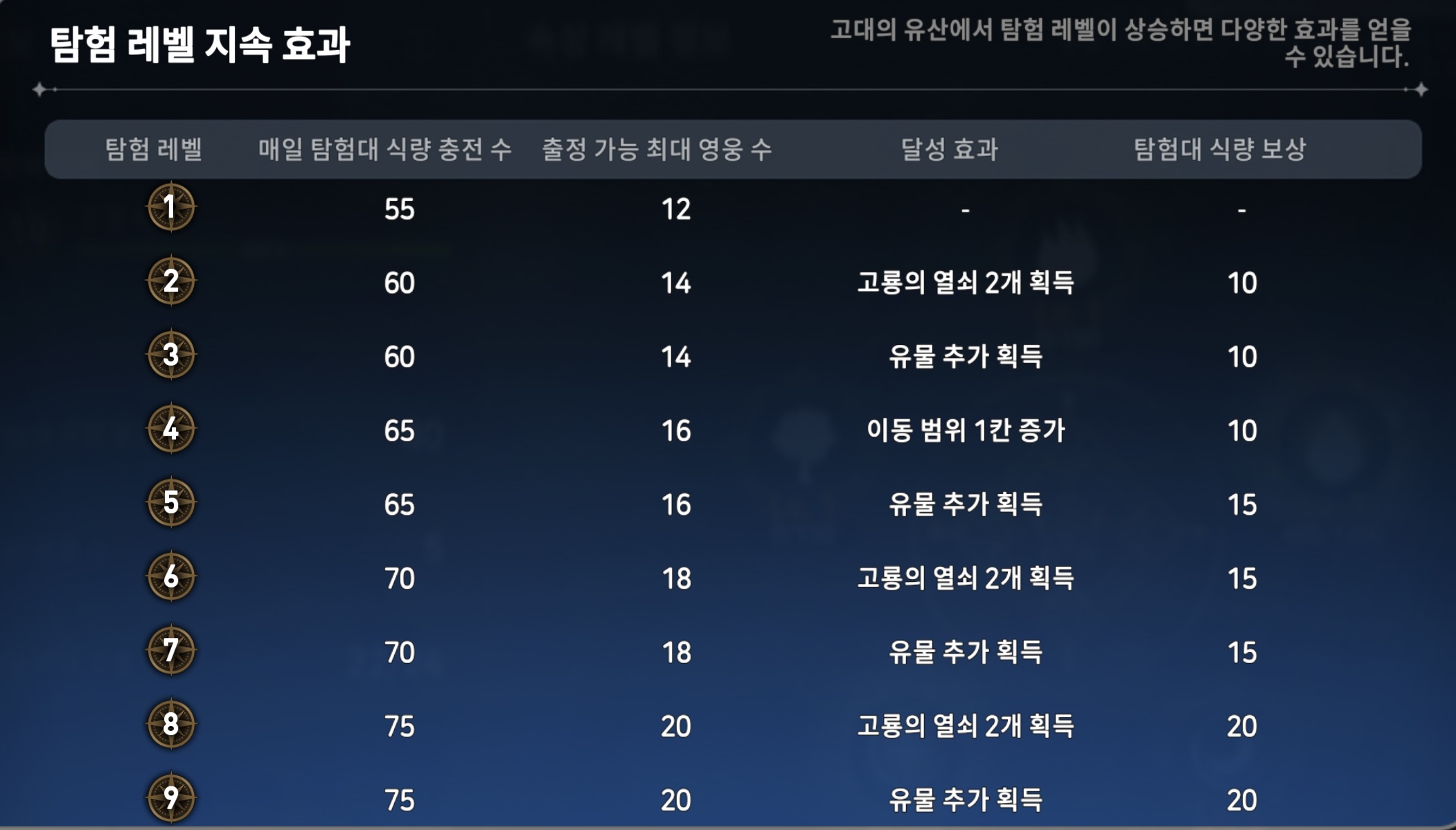 레벨이 오르면 그에 따른 장착 가능한 유물이 많아지고, 일일 획득 식량이 많아지면서 보다 많이 움직일 수 있기 때문입니다.