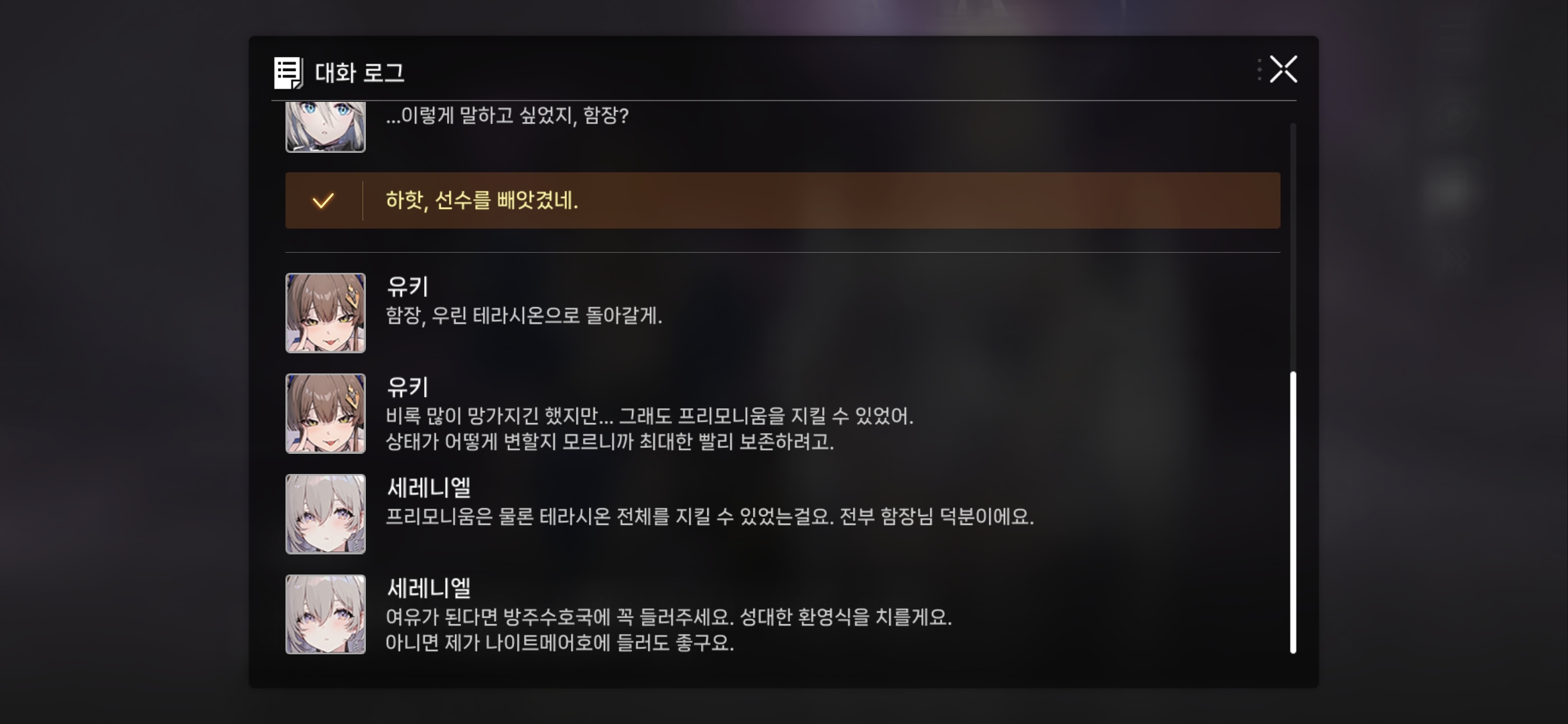 그리고 현재 함장에게는 업적이 없고 치즈루나 세레니엘과 유키와 엮이긴 했지만 사건의 핵심이 되기엔겉돌고 서사의 기여도가 낮다. 물론 이벤스가 모두 기-승-결 해버려서 문제지만