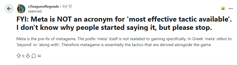 이렇게 메타라는 단어는 처음에는 정치를 게임 이론에 빗대어 표현하기 위한 용어로 출발했지만 이제는 게임 내에서 유행하고 있는 전략을 뜻하는 표현이 되었습니다. 지금도 많은 분들이 자신의 전략을 가장 직관적으로 표현하기 위해 XX메타라는 말을 사용하고 있는 걸 보면 당분간은 메타의 자리를 넘겨받는 다른 단어가 나오지 않을 것 같아요 ㅋㅋ