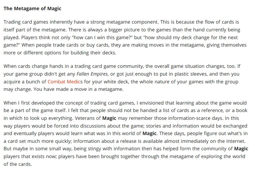 물론 정치학자의 손에서 나온 단어였기에 처음에는 존재 자체도 몰랐던 분들이 많았지만 매직 더 개더링의 개발자 리처드 가필드가 TCG라는 장르에서 메타게임이 어떤 식으로 적용되는지에 대한 이야기를 내놓은 걸 시점으로 메타게임이라는 단어가 본격적으로 게임계에서 사용되기 시작했습니다.