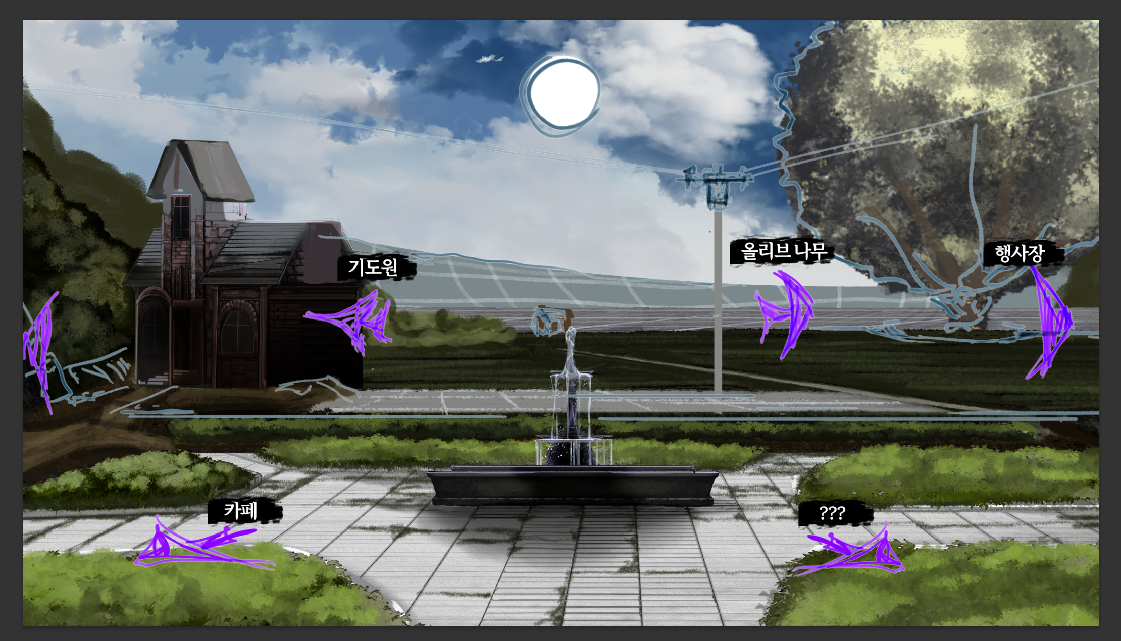 기존의 이동 방식을 보완하여, 마을 내 주요 거점으로 더욱 빠르고 효율적으로 이동할 수 있는 시스템을 구축했습니다.이에 따라, 마을 광장의 일러스트를 시스템에 맞춰 새로 작업 중이며 작업 중인 새로운 마을 중앙 광장 일러스트를 공개합니다.
