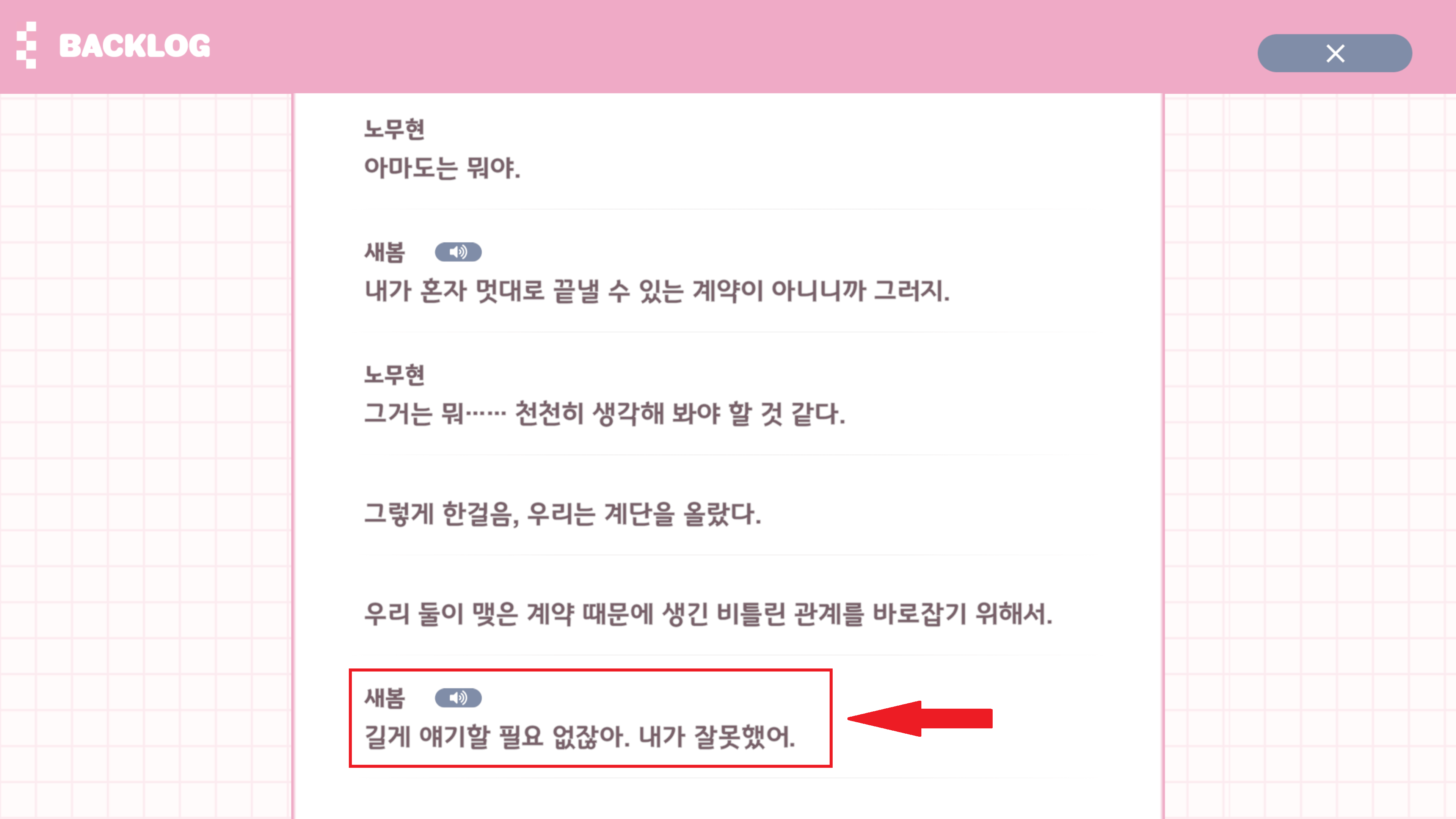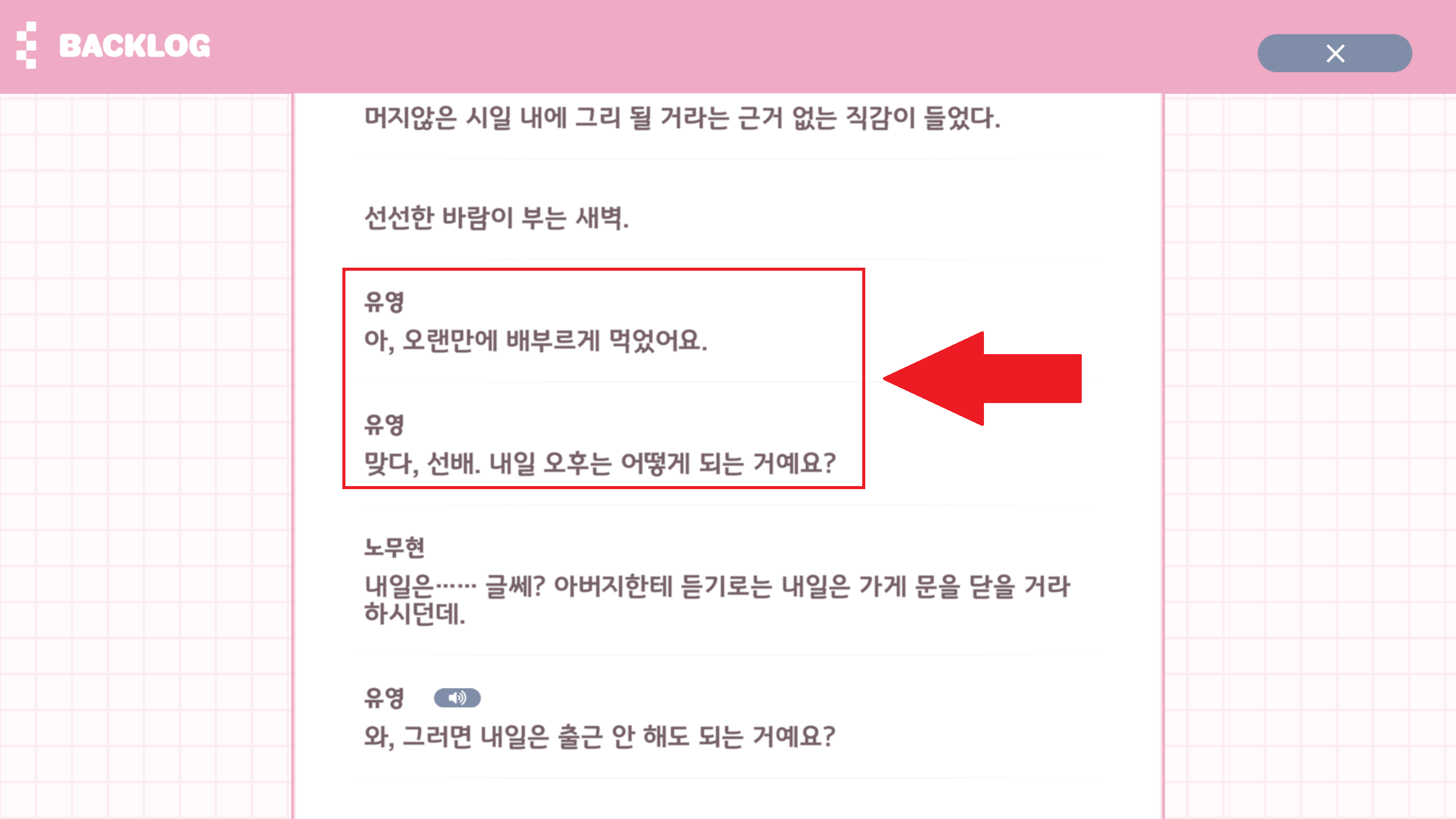 바로 아래에 "와, 그러면 내일은 출근 안 해도 되는 거예요?" 대사 옆에는 스피커 버튼이 있어서 백로그에서 선택하면 대사를 몇 번이고 더 들을 수 있는 것과는 다르게 유독 저 두 줄만큼은 목소리 파일이 아예 존재하지 않는 것처럼 보입니다.