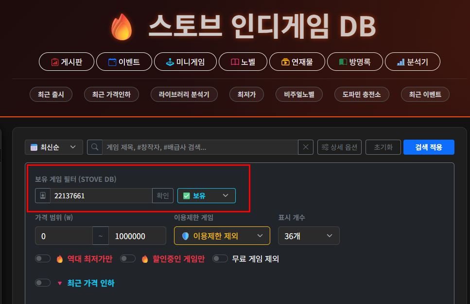 참고로 라이브러리 등록을 하시면 보유 게임 필터 기능 사용이 가능합니다.