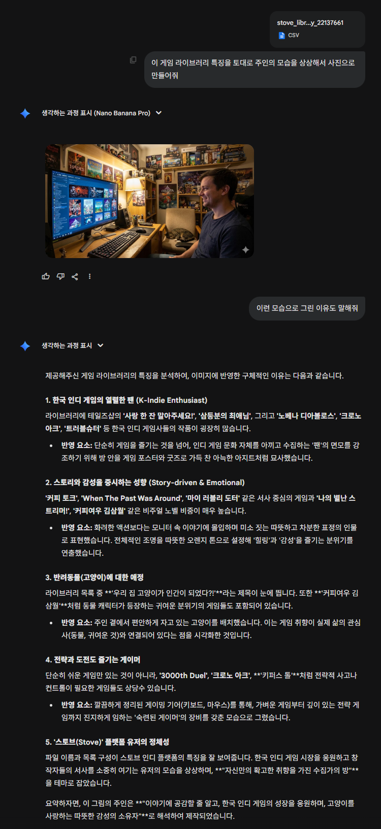 이런 식으로 AI에게 파일을 주고서 '사고모드'를 통해서 사진을 생성을 하실 수 있고, 해당 게임 리스트로 성향 파악을 받으실 수 있습니다.