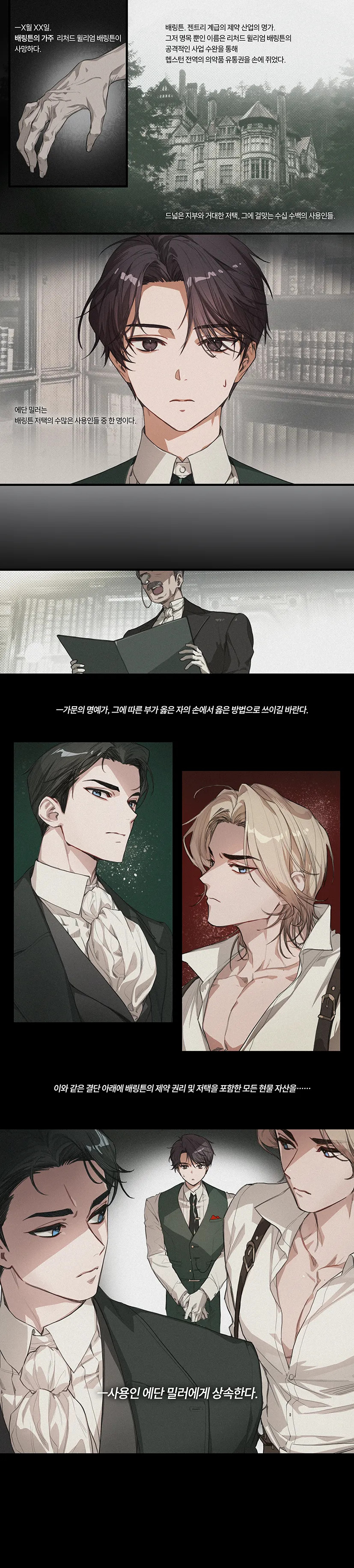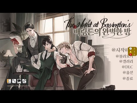 < 배링튼의 완벽한 밤 > 은 영국 빅토리아 시대를 배경으로 한 BL 미스테리 비주얼 노벨 게임입니다. 젠트리 계급의 가문 '배링튼'. 그 곳의 사용인인 주인공 '에단'은 갑작스럽게 상속자가 되어 저택의 두 아들인 '애셔', '맥시밀리언'과 얽히게 됩니다. 곧 '에단'의 앞에 배링튼을 둘러싼 비밀들이 하나둘 모습을 드러내는데―.