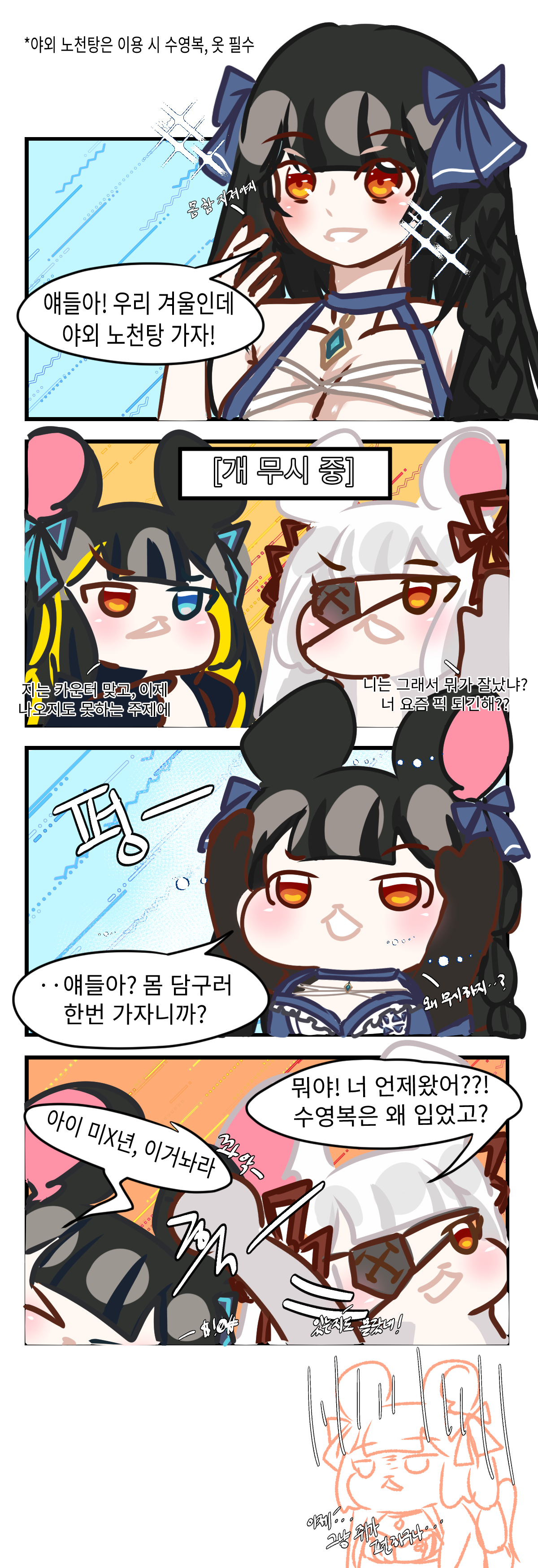 나름대로 핸드폰으로 열심히 한거치고 괜찮게 나온거 같애서 아주 뿌듫함니다..,ヽ( ᐛ )ノ 그런 의미로 최근 제주여행을 가서 야외노천탕(혼탕) 체험해본게 생각나서 카쥐 만화도 그려봗으니 많관부 부탁드려오 ಇ( ˵ᐛ ˵)ಇ