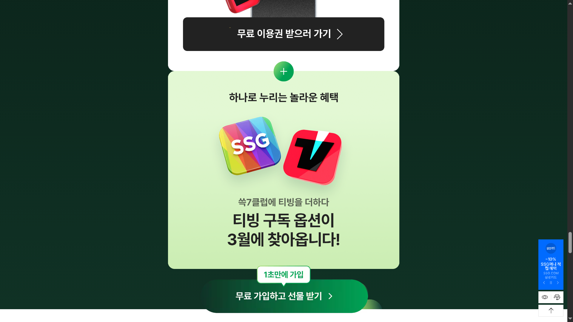 ssg에서 이번에 유니버스 클럽이 사라지고 자체적으로 나와서 론칭을 하게 되었는데... 2개월 무료로 주면서 티빙 1개월까지 무료로 줍니다..