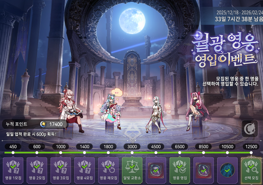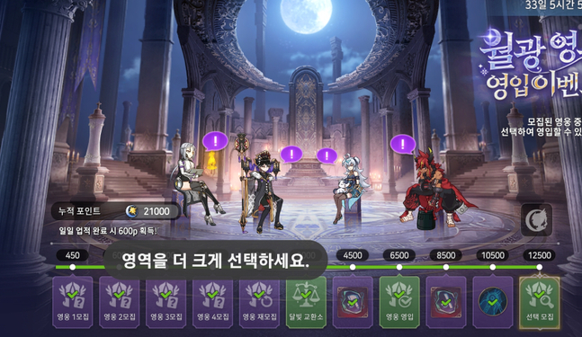 특히나 이번 이벤트는 영입 대상의 영웅들이 달빛 전당’에 모여 앉아 마치 또 다른 로비처럼 보여요!