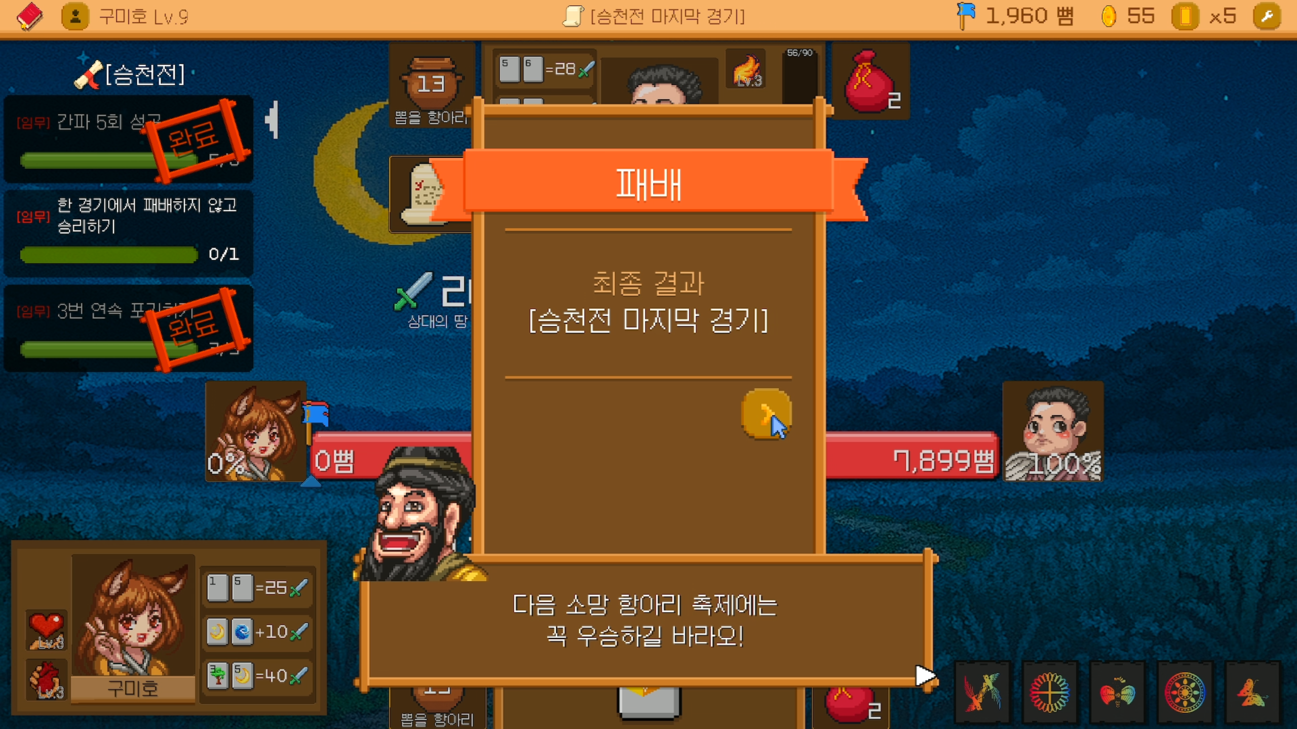 - 각 토너먼트 마지막 보스들이 확실히 난이도가 높은 느낌이 든다. 특히 승천전 마지막 경기 우투리는 3차전 상대보다 약 3배의 체력을 가진 6천점이라 두세판만에 돈을 다 뜯겨 게임 오버되었다.