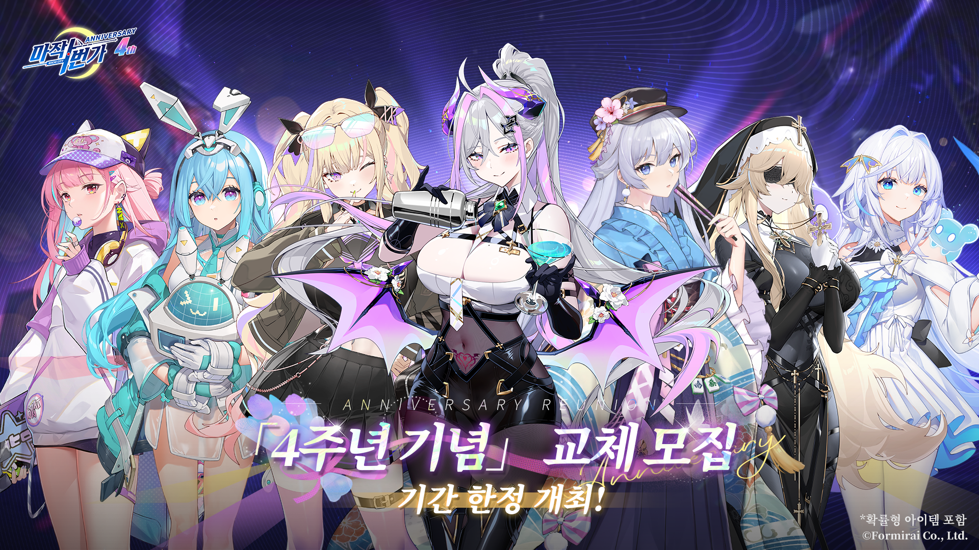 4주년 이벤트 기간 중 작사「레이제이 에메코」「엘라」「최효린」「쿠키 렌신」「후와 마히루」「토호 나기」「세라피나」「이가라시 사에코」「로렐라이」「메니야」「코쿠라 카나데」「오토나시 이쿠코」「하라 미치유키」「후카세 아리스」「히즈키」「사오토메 유리카」「엘시」「모리 루카」「나츠우미 마린」「이누카이 히나」「시라하 아스카」「카자마 시즈쿠」「모에기하라 아오이」「긴」의 모집이 순환되며, 진행 중인 모집의 획득 확률이 상승합니다!