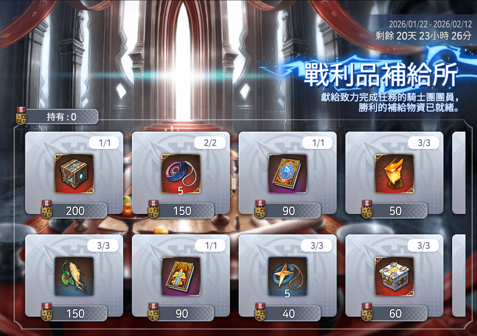 可使用在<戰力增強期間>活動中,透過完成任務所獲得的活動財物「騎士團勳章」,兌換各式各樣的道具。