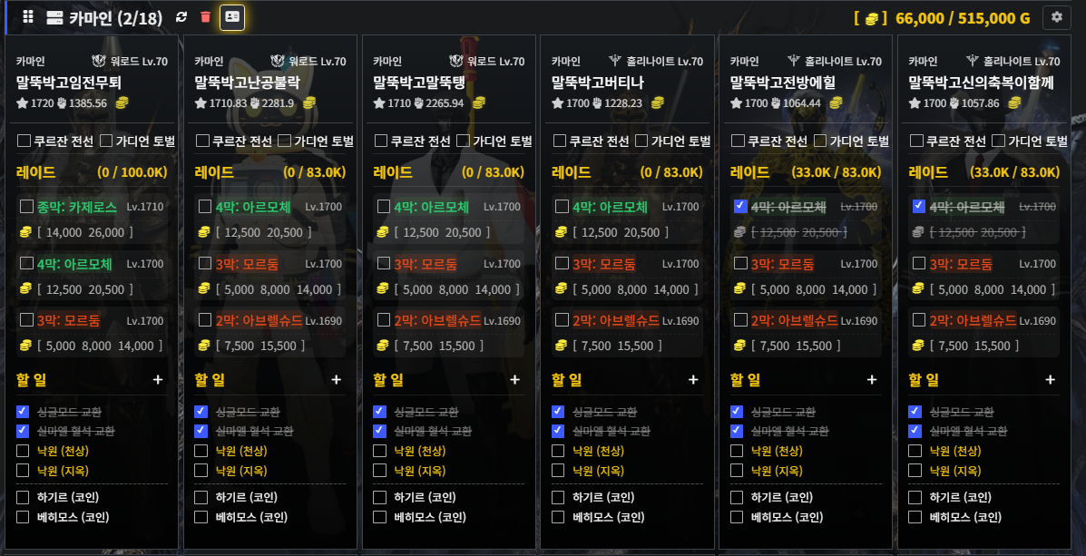 - 캐릭터별 일일/주간 정리