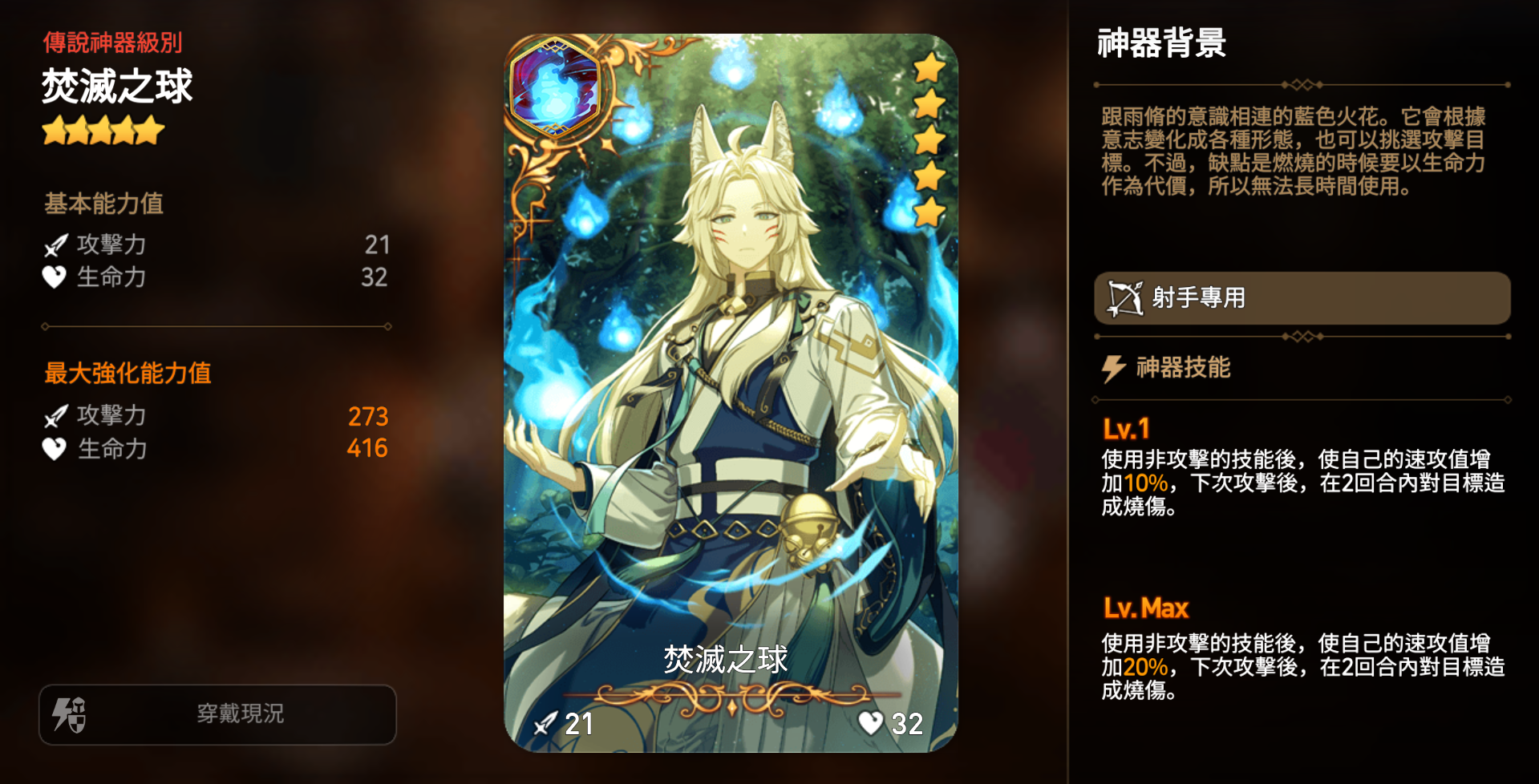 可使敵軍受到燒傷的傷害量增加的火焰屬性射手-「雨脩」!以及在使用非攻擊技能後,可使自己的速攻值增加,且下次攻擊後,可對目標造成燒傷的射手專用神器-「焚滅之球」,請試著在召喚機率UP!中遇見他們吧!