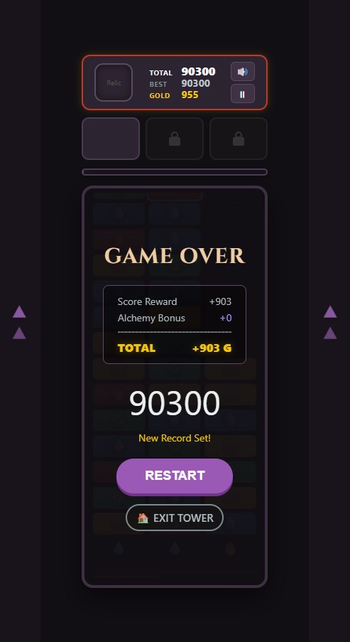 성장: 단순히 퍼즐만 푸는 게 아니라, 획득한 골드로 상점에서 아이템(주문서, 폭탄, 모래시계)을 해금하고 유물(패시브)을 뽑아 능력치를 올려야 고득점이 가능합니다.