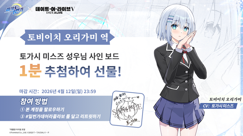 We will give an autograph board of #토가시미스즈, the voice actress of Origami Tobiichi, to one lucky user through a lottery!