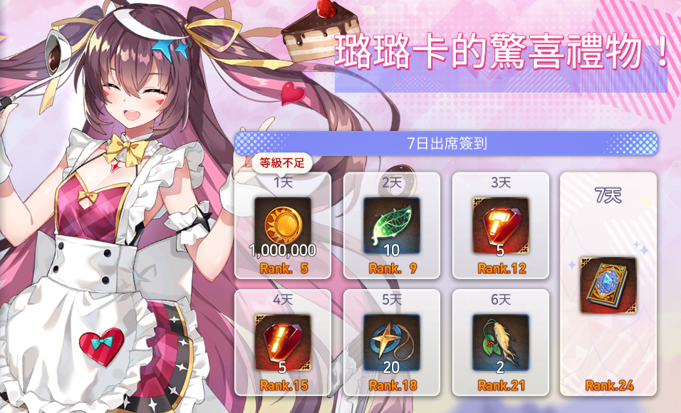 登入天數 | 帳號Rank限制 | 道具名稱 | 數量 |