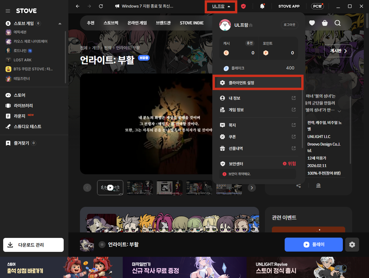 스토브 클라이언트를 종료하고 게임을 재설치해 주세요.