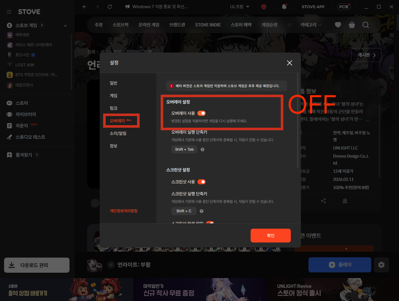 PC 클라이언트 설정에서 스토브 오버레이 기능을 OFF로 변경 후