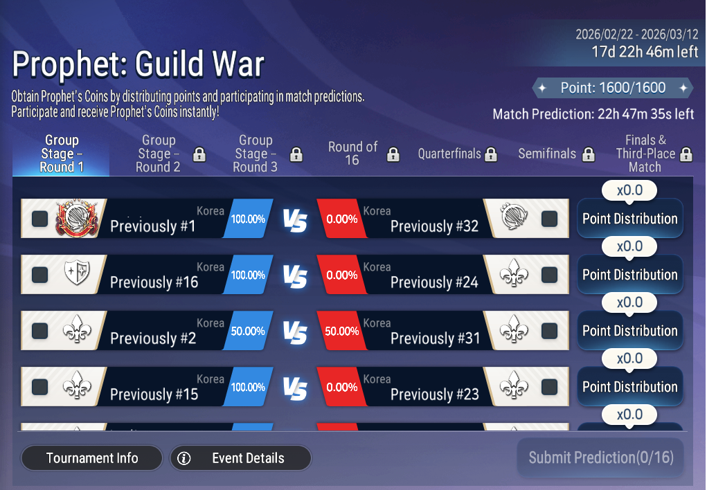 Which of the 32 Guilds will rise to the top? Predict the winners and earn a variety of amazing rewards using given points!