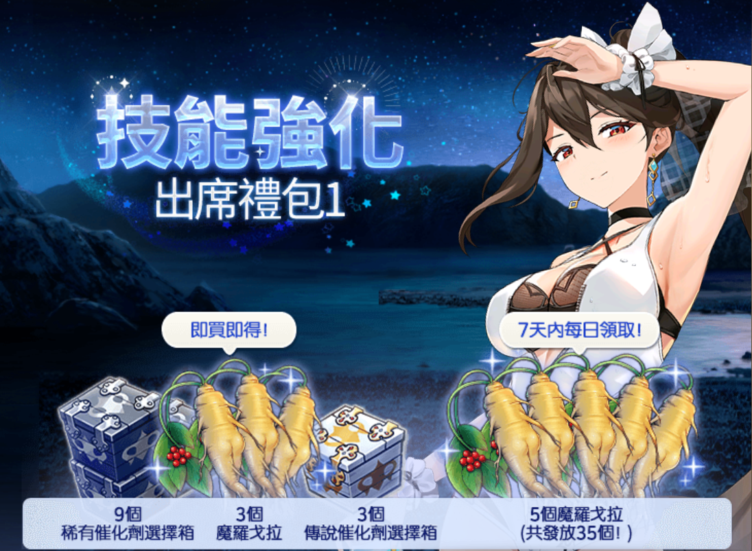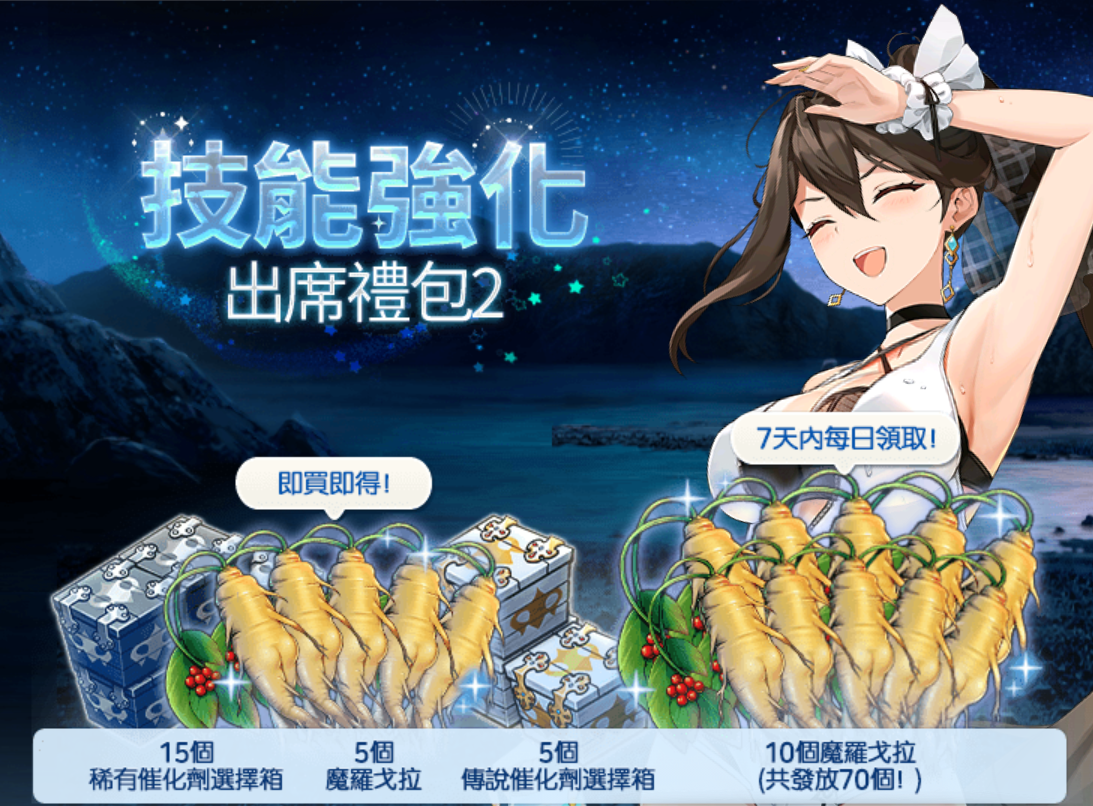技能強化出席禮包2 | 魔羅戈拉(立即發放) | 5 | ||