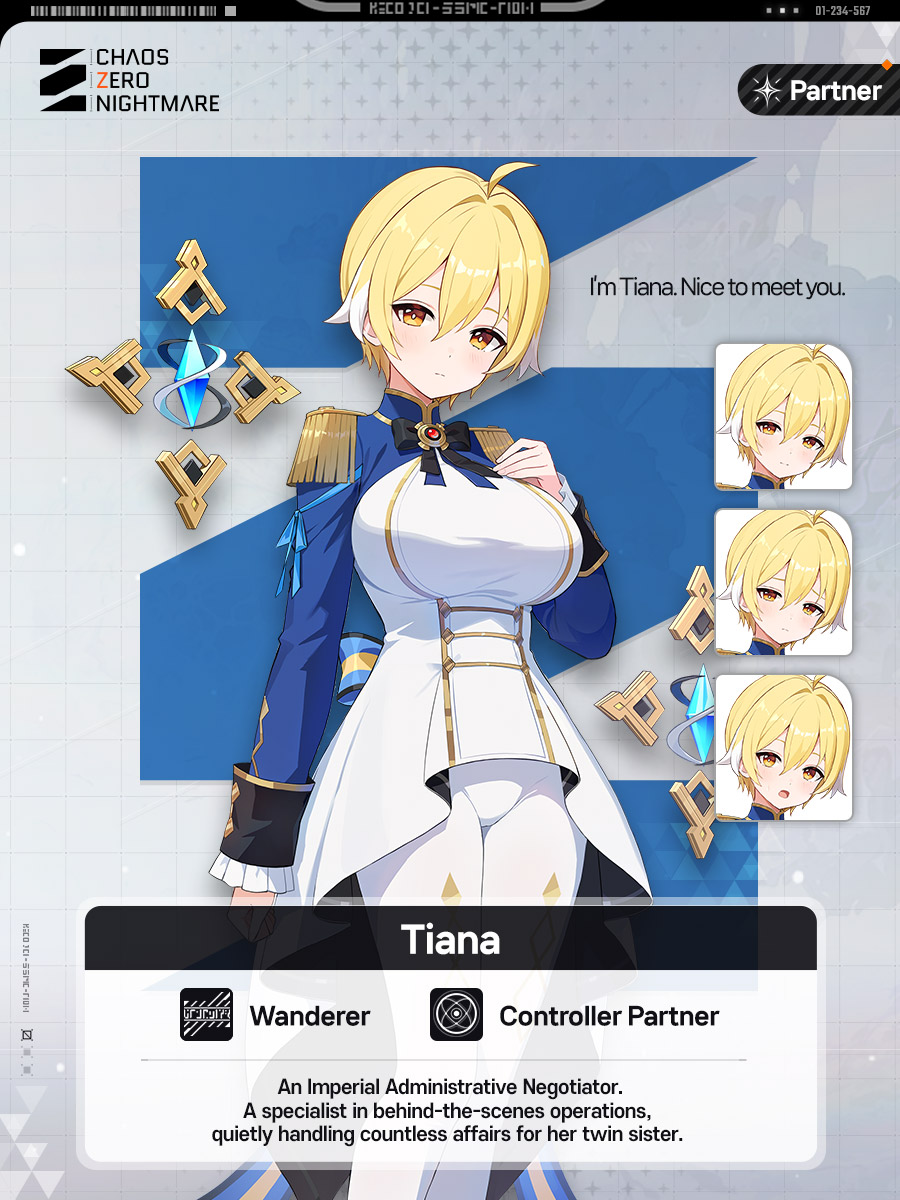 Introducing the Controller partner, 「Tiana」, an administrative negotiator of the Xera Empire and a planetary-environment researcher. Unlike her older twin sister Tiphera, she gives off a calm and quiet impression.