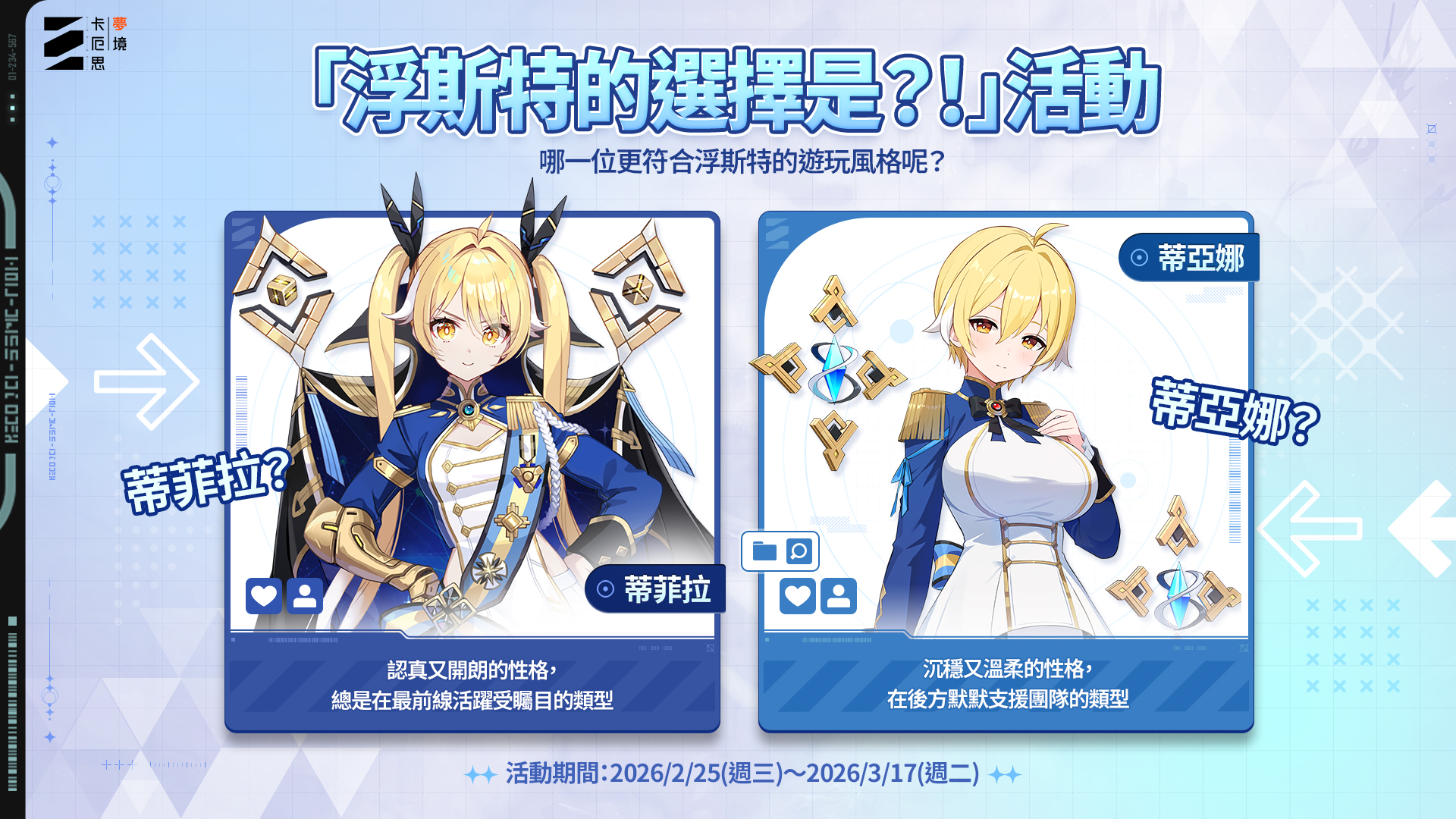 從「蒂菲拉」和「蒂亞娜」中選擇一位,依照【UID/蒂菲拉或蒂亞娜】的格式留言即完成參與!
