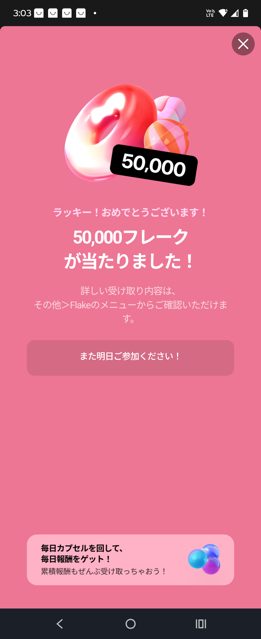 カプセルガチャは、プラマイゼロだったけど、チェックインFlakeが五万とはラッキー!!