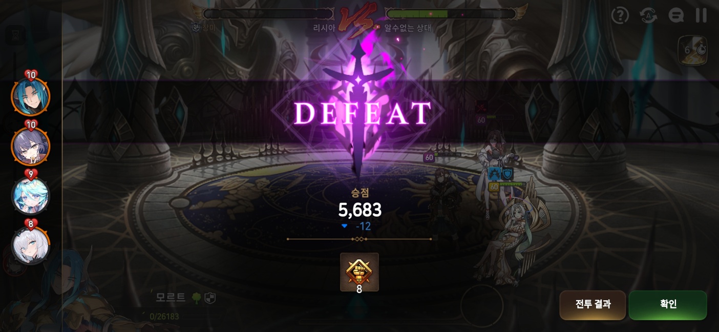 위의 이미지는 레전드 등급에서 상대편을 공격했다가 실패했을 때 -12점이 감소한 모습입니다.