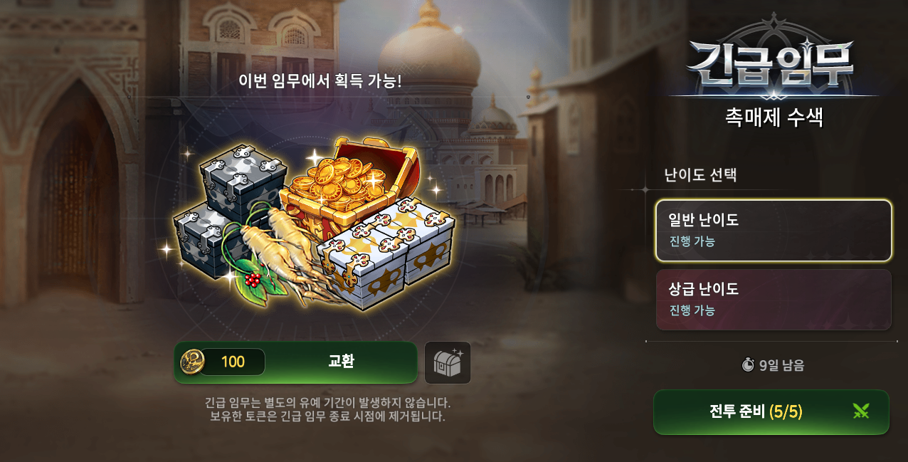 - 긴급 임무는 매일 5회 입장 기회가 제공됩니다.