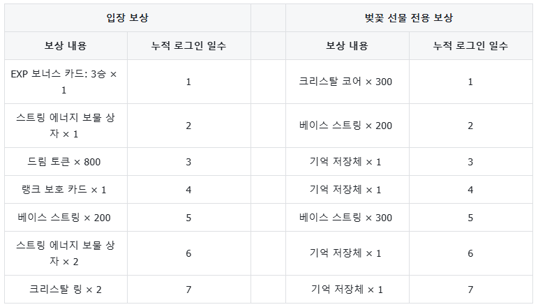이벤트 기간 동안, 네비게이터는 매일 게임에 로그인하여 순서대로 보상을 해제할 수 있습니다. 또한, 네비게이터는 추가로 '벚꽃 선물'을 구매하여 더 풍성한 보상을 해제할 수 있습니다.
