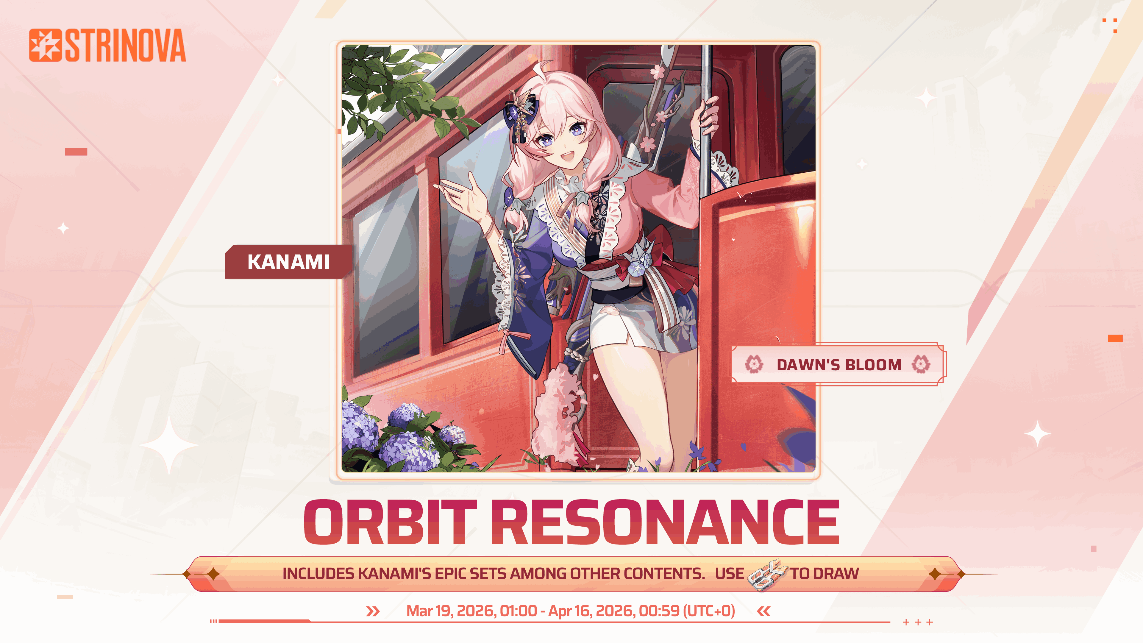 「별의 울림」이 기간 한정으로 오픈됩니다. 네비게이터는 「울림 저장체」를 사용해 공명을 진행할 수 있으며, 일정 확률로 신화 등급 스킨 「카나미 - 새벽학의 속삭임」과 신화 등급 무기 스킨 「밤하늘의 벚꽃비」를 비롯해, 그 외 희귀 및 고급 등급의 다양한 보상을 획득할 수 있습니다.