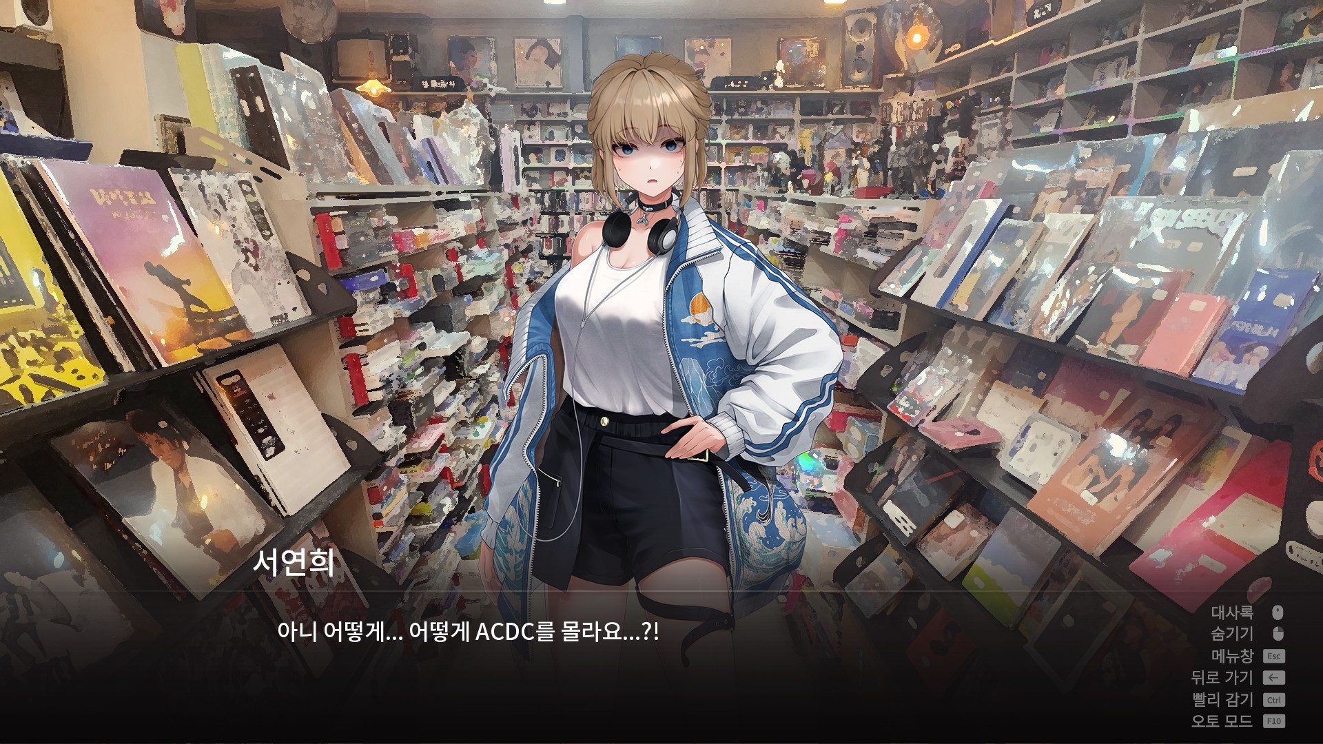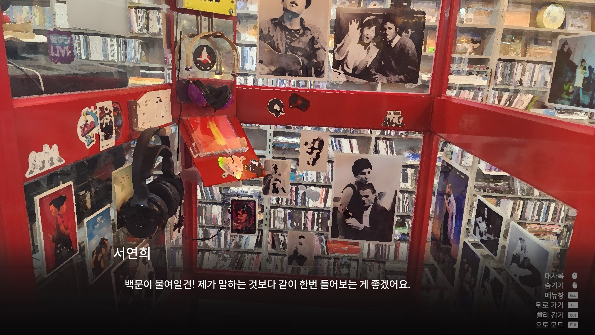 내가 처음 이 게임을 끝내고 든 생각은 "음반가게를 가보자."였다. 솔직히 이유는 잘 모르겠다. 그냥 가고 싶었다. 지도앱을 켜서 음반가게들을 확인하는데 "응? 여기 되게 익숙한데?"싶은 가게가 보였다. 게임에 나온 '금강레코드'의 모티브가 된 가게였던 것이다. 집에서 그리 멀지는 않았다. 평소에도 기타는 쳤지만 락쪽은 문외한 수준이었다. 그래서 그냥 게임에서 연희가 언급한 AC/DC의 Back In Black을 코너에서 찾았다. 인기가 많은 음반이었는지 하나밖에 안 남아있었다.
