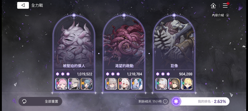 Is there anyone like me who feels this full-effort battle (9 stars) is difficult? Although this full-effort battle can use save data from previous seasons, to complete it, you need 900,000 points in each room (although you only need 600,000 points in each room to get all the crystals). For a free-to-play player like me, the difficulty is a bit high (or maybe my game understanding is not enough). Based on my score yesterday (assuming 2.7 million is a full completion), I guess that by the end of the event, less than 10% of the server will have completed it.