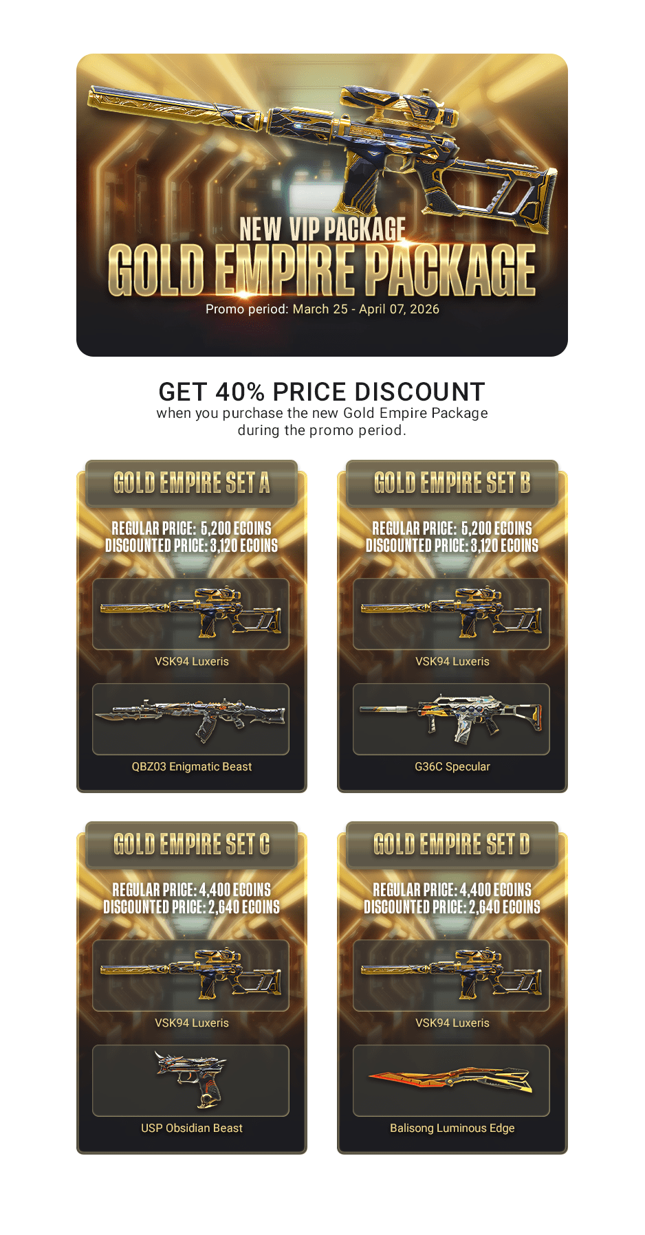 Get 40% price discount when you purchase the new VIP Packages Gold Empire during the promo period.