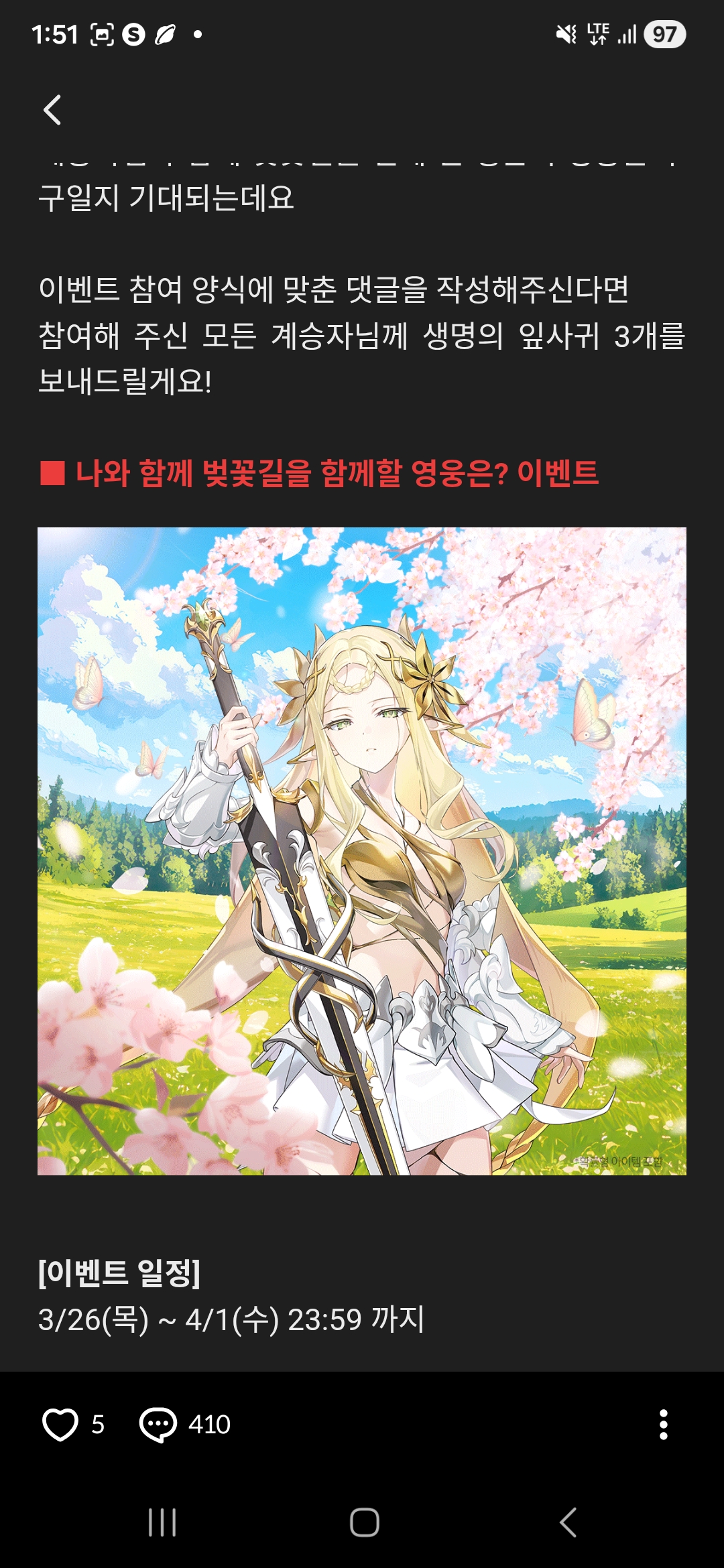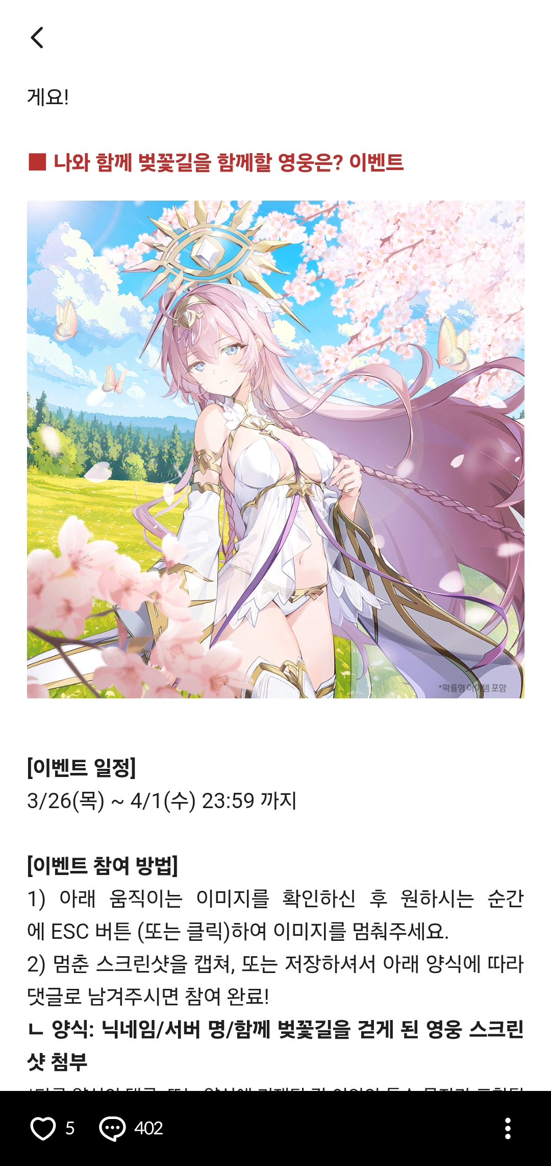 ㄴ 양식: 닉네임/서버 명/함께 벚꽃길을 걷게 된 영웅 스크린샷 첨부