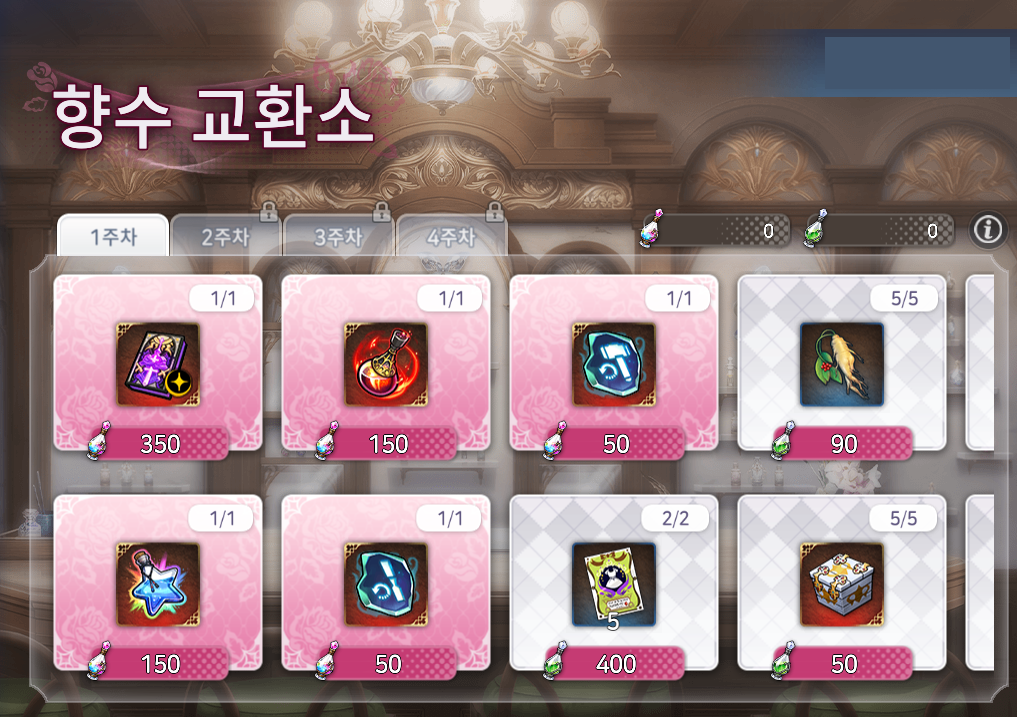 획득한 향수를 사용해 원하는 아이템을 주차 별로 해금되는 교환소에서 획득할 수 있습니다.