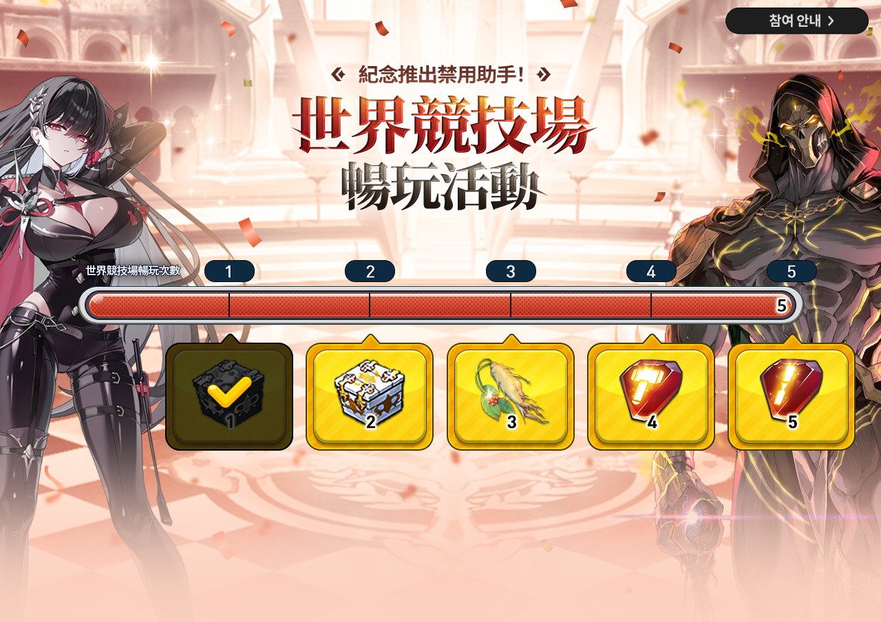 活動期間內,依據於世界競技場中的遊玩次數,可獲得對應獎勵。(每項獎勵僅可領取1次)